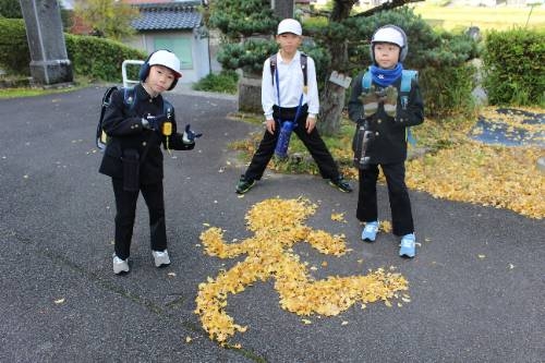 ◇奥出雲町金言寺の大イチョウ(推定樹齢700年、高さ33Ⅿ、幹回り6m)を見に行きました。銀杏の葉っぱで描いた♥が出迎えてくれました。阿用小でも下の画像のように銀杏の葉っぱで同じようにしてみました。子どもたちの中で真っ先に気づいたのは3年の和田絆さんでした。銀杏の葉っぱは、毎日教頭先生が竹箒で掃いてくださっています。