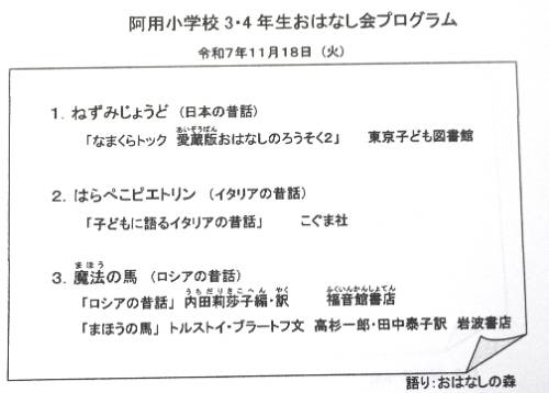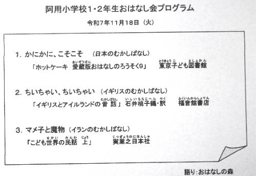 第2回 ストーリーテリング 2025-11-18 10:10:09 ◇本年度2回目の「おはなしの森」の皆様をお迎えしてのストーリテリングでした。今回は高学年から始まりました。最初のお話はみんながよく知っている「3枚のお札」でしたが、鬼婆が追いかけてくる迫力がすごく伝わってきて、聞きなれた話が、まるで別の話のように感じられるほどでした。今日のお話の内容は、下記の通りです。