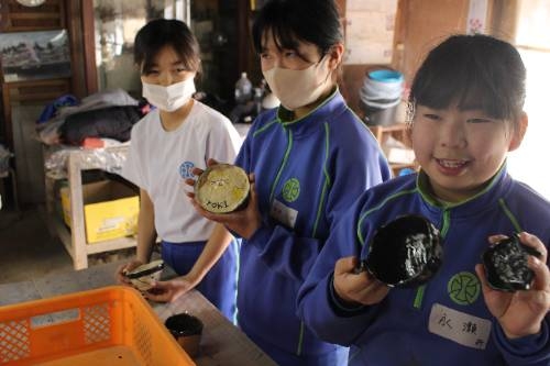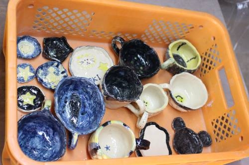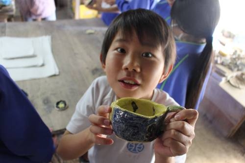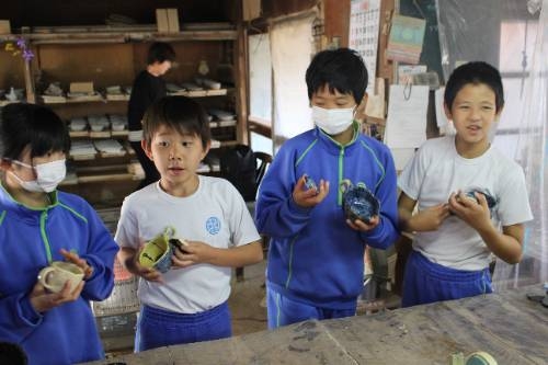 ◇5年生は11月から陶芸に取り組んでいます。指導してくださるのは『大東窯』の大西さんです。12月15日は待ちに待った窯出しの日で、作品を受け取りに行きました。焼きあがった自分の作品を手に取って満足そうな7人の5年生でした。