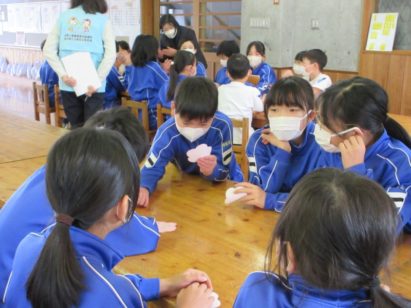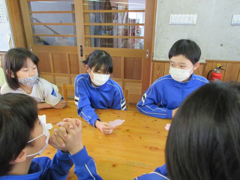 この他、縦割り班でほっかほかの樹カードを紹介し合いました。カードには、同じ縦割り班の友だちのよいところをみつけて書いています。紹介する児童も、読んでもらった児童も嬉しそうに笑顔を浮かべていました。