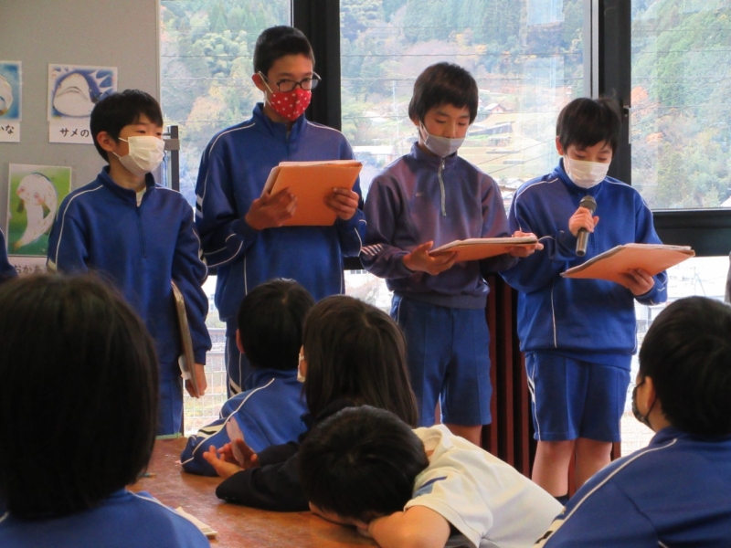 お話を聞いた後、縦割り班のグループで感想を交流しました。1人1人自分が感じたことを自分の言葉で話していました。それぞれのグループの代表者が感想交流をまとめたものを発表しました。