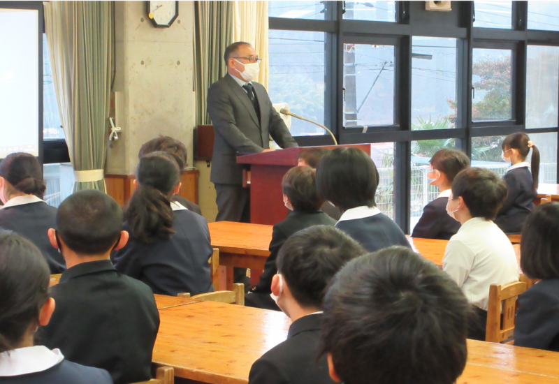 今日は、全校児童がランチルームに集まり2学期終業式を行いました。