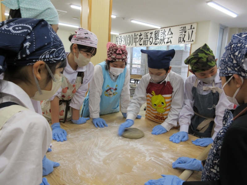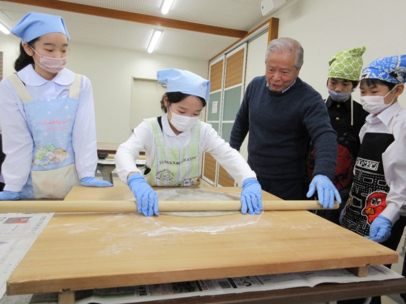終業式を終えると、今年も4年生・5年生・6年生は日登交流センターへ移動し、地域のみなさんと一緒にそば打ちを経験しました。