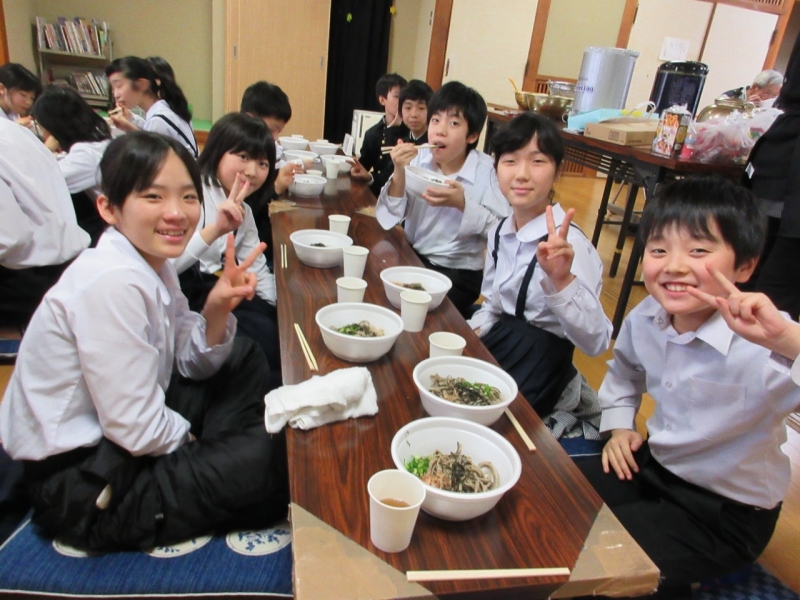 配食活動を終えると、自分たちが打ったそばを地域のみなさんと一緒にいただきました。みんな「おいしい。」とおかわりをして食べていました。心もおなかも満たされた時間となりました。