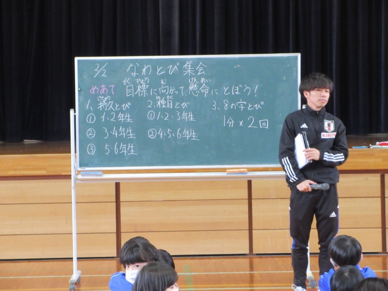 子どもたちは、この日に向けてなかよし班で集まり八の字跳びを練習したり、休み時間に個人技を磨いたりしてきました。