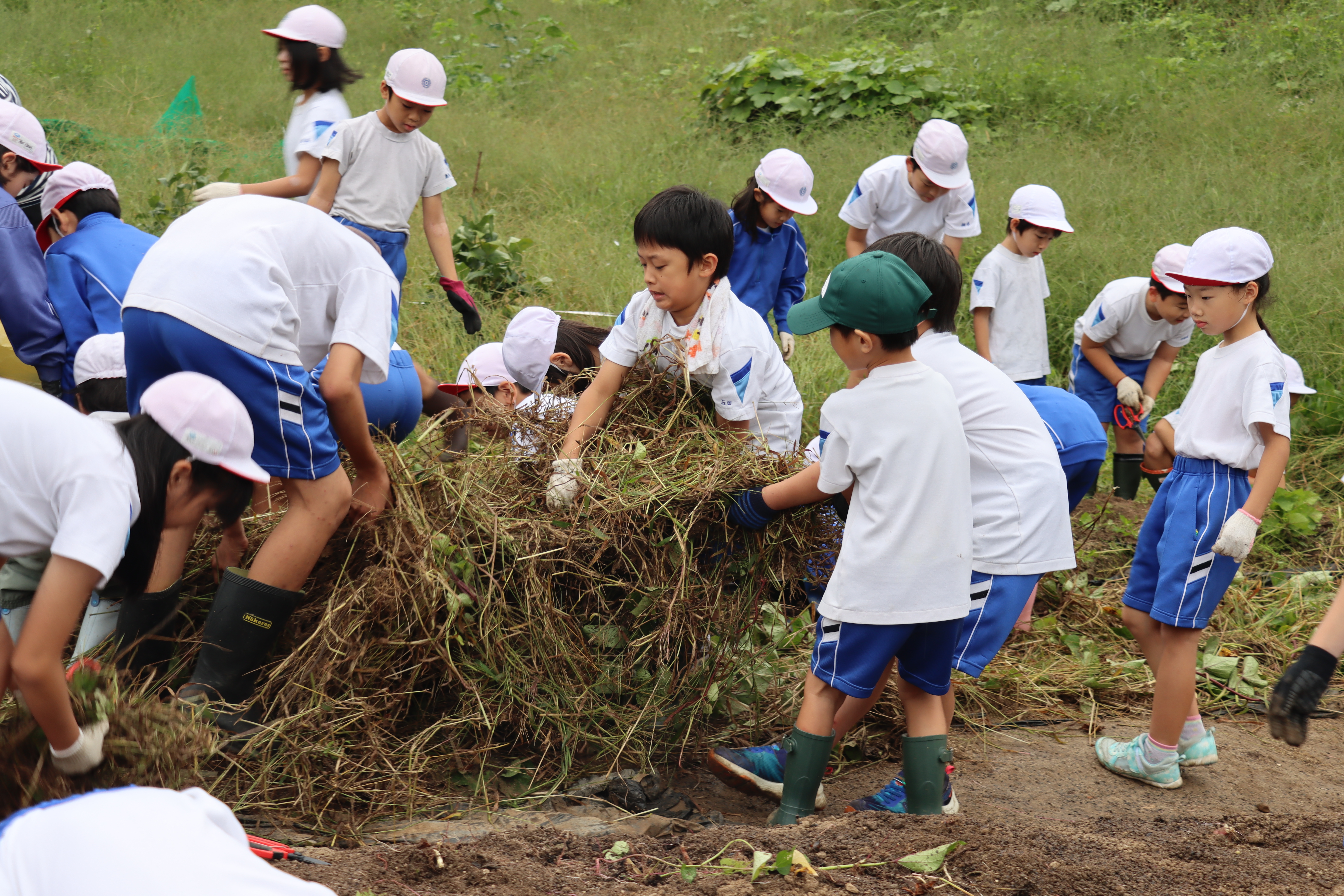 それでも、マルチの片付けと草取りを頑張ろうと、全校で畑に向かいました。芋の数は少なかったのですが、みんなでつるを引っ張り、根っことの綱引きを楽しみました。貴重なお芋が出て来たときは大喜びでした。