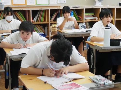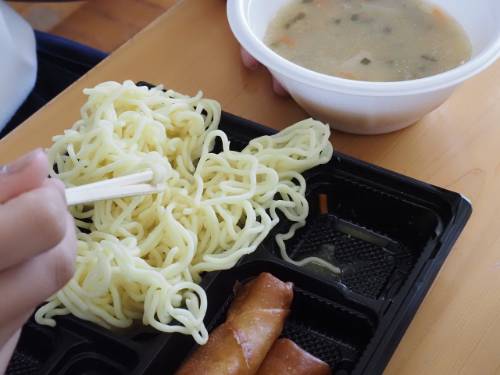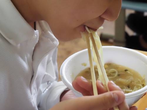 今日の麺は一袋でお腹がいっぱいになりましたが、さすが中学生、2袋完食も。つけ麺タイプで食べている人もいました。皆さん、汁が飛ばないように絶妙なすすり方です。ラーメンだけでなくそばやうどんもですが、日本の麺をすする文化になじめない外国の方もいるそうです。ただ、食事中のことなので日本だってすする音に限度がありますよね。