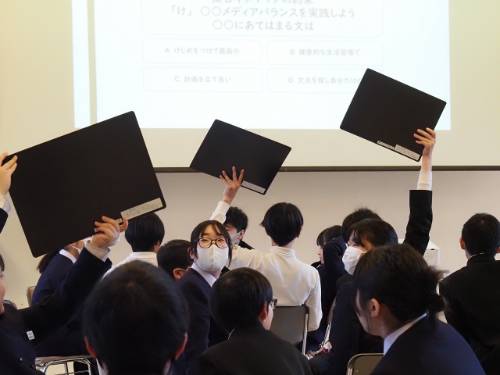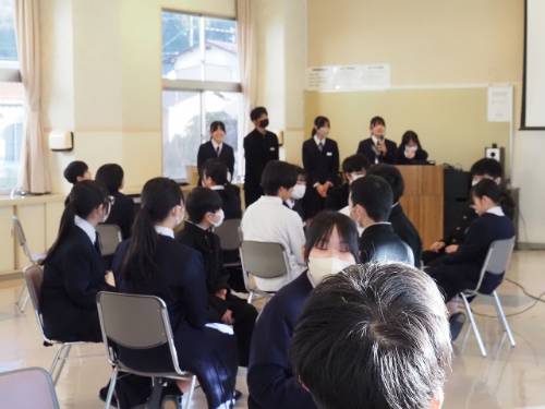 生徒会朝礼は「学校クイズ」です。校歌の歌詞や3つの校訓、私が命名した「テン」のことも問題になっていました。ほぼ全問正解の班があって「掛合中愛」を感じました。