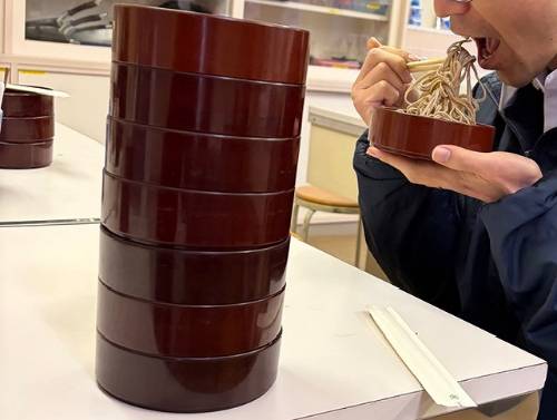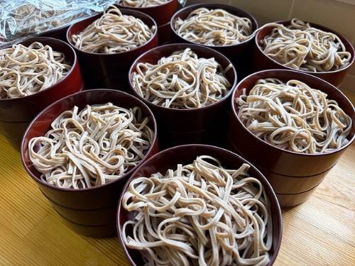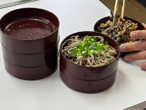 2025.12.25 Happy Lunch Time 先生方の昼食は「年越しそば」です。職員がゆでて盛り付けをしました。割子(器)は地域CNさんが秘密の場所から調達しました。薬味も5種類あって本格的です。おいしかった~ぁ。 1段がけっこう大盛で3段でお腹がいっぱいになりますが、皆さんそば好きのようです。最高は8段でした。ちなみに今までの最高記録は・・・・・