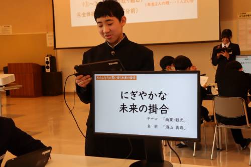 教職6年目研修の報告もありました。あの頃の私を思い出しながら聞いていました。中堅研修に向けて更なるスキルアップを期待します。同じような写真が並びますが、1年生が今年度の総合的な学習の時間の成果発表を行いました。聞き手は先輩の2年生。どんなアドバイスがあったんでしょう。そういえば前任校でもそんな光景を見かけました。あの時はパワポの作り方や「伝える力」へのダメ出しが凄かったけど、その学年、2年後には文化祭ですばらしい発表をしました。掛合中の1年生もそうなることを期待しています。先輩の2年生もきっといい刺激になったはず!!
