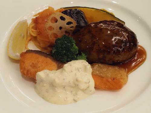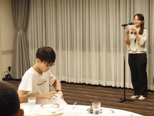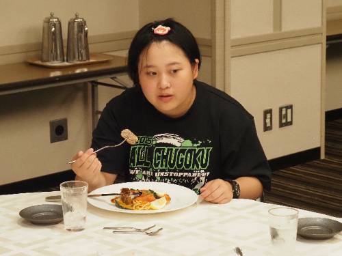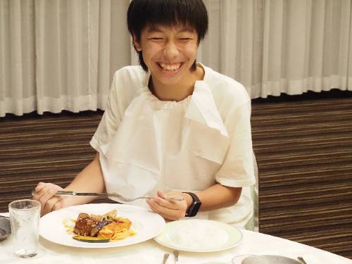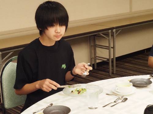 夕食はテーブルマナーの講座ではありませんが、サラダにスープ、メインはハンバーグと焼鮭タルタルソース、そしてデザートと紅茶です。ナイフとフォーク、スプーンを使っていただきました。今日も朝からたくさん食べて、男子は膨れたお腹を見せ合っていました(笑)