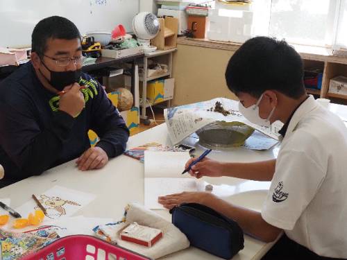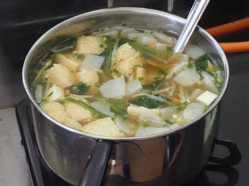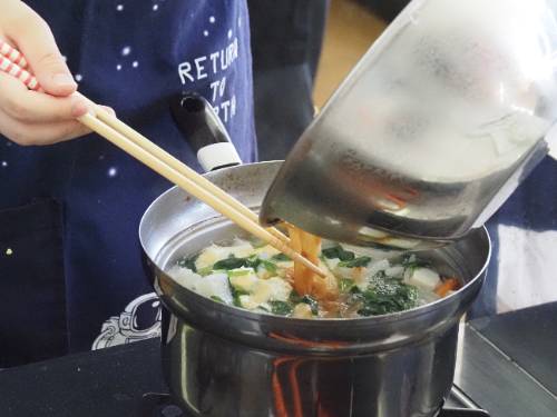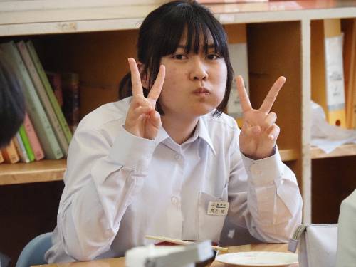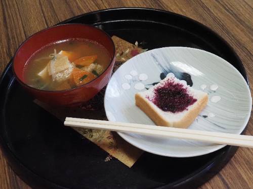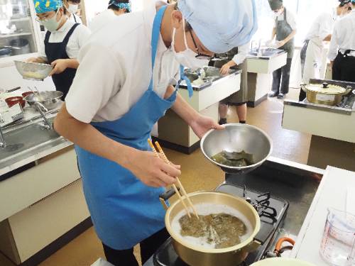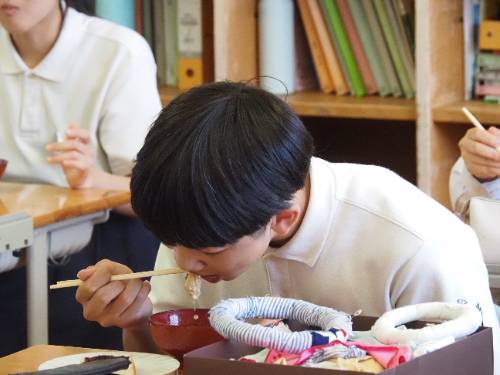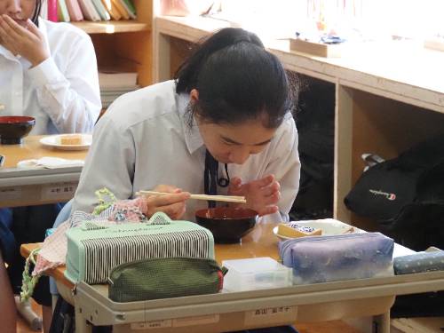 2年生の調理実習です。ご覧の通り具だくさんお味噌汁です。いりこと昆布のだしのとてもいい香りが廊下にも広がっています。減塩がテーマなので出汁と素材の味が生きています。もちろん味噌は地元産。パンのジャムもです。この味噌汁は11月1日(土)の町おこしイベントで提供されます。2年生は実際に調理してみて一足早くいただきました。と思ったら、3年生の分も作っていて教室にデリバリーです。「おいしい!!」、「初めての味」と感動していました。私もいただきました。出汁が旨し。