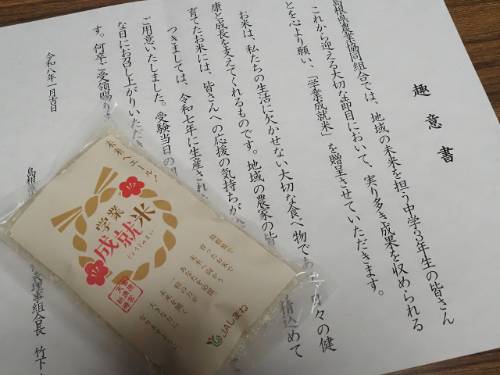 JAしまね掛合支店の支店長様から「学業成就米」をいただきました。何でも雲南市では10年位前から受験に向かう3年生に「お米」を贈呈されていたようですが、今年からそれが全県に広がったようです。支店長の話によると、私の前任校での贈呈式の様子がテレビで放映されるとのことです。