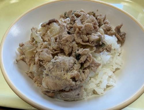 豚肉のスタミナ炒め丼にしました。大盛りのご飯があっという間になくなってしまいました。白菜スープが甘くておいしかったです。
