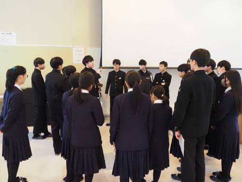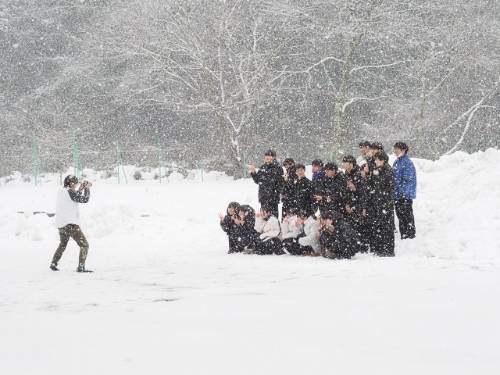 雪が舞う中でのクラス写真の撮影。ちょっと寒いけど凄くいい光景ですね。地震を警戒する中ですが、無事に3学期が始まりました。今学期の合言葉は「反省そして向上」です。例えがいまいちでしたが、ポケモンが力強くなるために、新たな能力を身に付けるために進化していくように、皆さんも向上していこうというお話をしました。