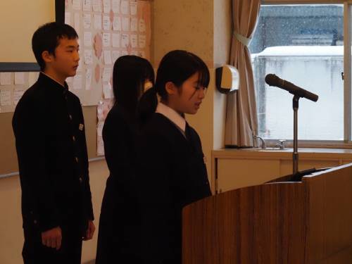 学年代表の新年の決意。どれも素晴らしかったです。向上が期待できます。生徒会役員の任命と委嘱式。生徒会長の言葉に掛合中の向上を確信しました。