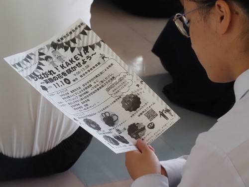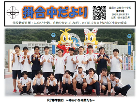 全校朝礼では、生徒会執行部から11月1日(土)に行われる「文化祭&町おこしイベント」の説明もありました。町おこしイベントは、3年生が中心の取組ですが、2年生や1年生も役割があります。体育祭同様、全校を挙げて取組む掛合中最大の行事です。すでに案内のチラシは町内に配付済ですが、学校だより第17号(9/19発行)、第19(本日10/9発行)にもイベント情報を掲載しているので是非ご覧ください。そして参加をお待ちしています!!