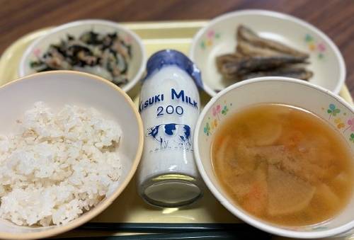 2025.11.7 Happy Lunch Time 明日の「いい歯の日」にちなんだ献立です。カルシウムが豊富な牛乳は毎日ですが、骨ごと食べられるイワシの米粉揚げ、噛み応えのある根菜の味噌汁が歯を鍛えてくれます。でも今日はバタバタしていて急いで食べたので効果なしです。(←私は!!)