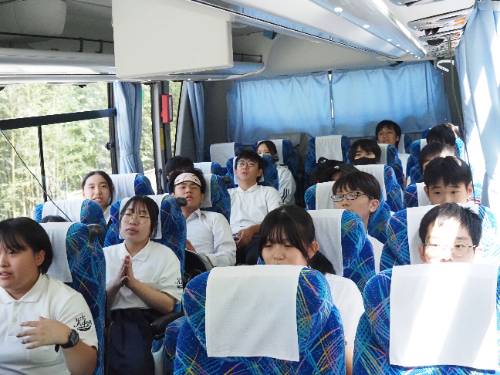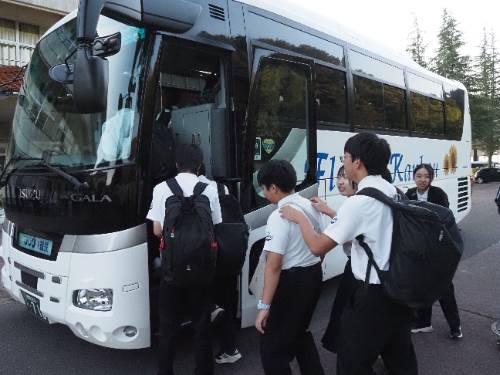 素晴らしい集合。予定より8分早い6時52分、3日間の「未知との遭遇」の旅が始まりました。修学旅行の出発です。道の駅「世羅」で休憩が終わると、バス内はおやつの時間とレクで一気にテンションがマックス。クラスの秘密クイズやカラオケで盛り上がりました。今のところ最高点は92点です。このあと、誰が記録更新するんですかね~。1枚目の記念撮影は瀬戸大橋の与島PA。みんないい笑顔です。その後、緊急トイレ休憩がありましたが、12時に昼食場所の月ケ谷温泉に到着しました。bigしいたけ御膳の完食は6人。しいたけの天ぷらに焼きしいたけがメイン。それにしても大きかった。