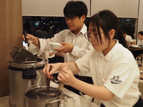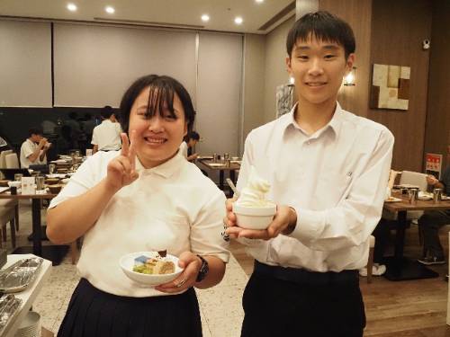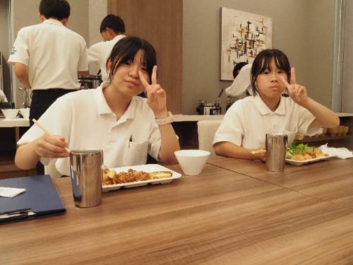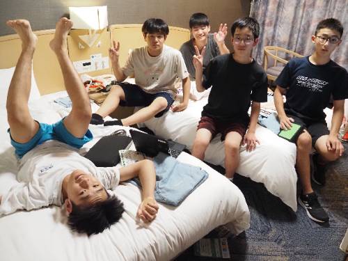 研修を終えバスに乗ると再びレクが始まり、予定通り7時前にホテルに着きました。夕食はバイキングです。皆さん、思い思いのマイプレートを作って楽しんでいました。お昼のしいたけ御膳をほとんど残した人たちももの凄い勢いです。カレーにラーメン、唐揚げにチャーハン。しめはスイーツににソフトクリーム。これを2回転ぐらいした人もいたような気がする。もちろん先生方も攻めの姿勢です。この後は入浴、今日の反省とお楽しみの自由時間。以上、夜9時までの様子です。