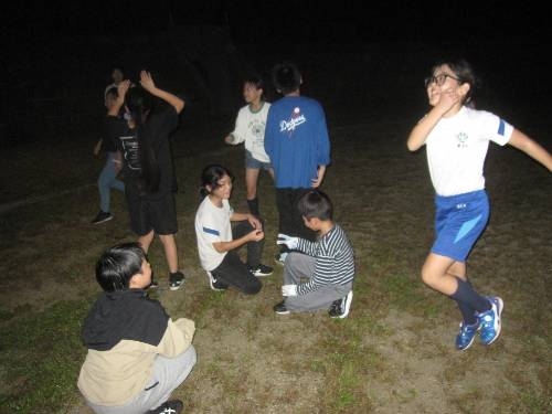 キャンプファイヤーでは、班ごとのスタンツで楽しい踊りやゲームを用意し、みんなで楽しみました。オリジナルの振り付けを考えたり、まさかの罰ゲームがあったりして大変な盛り上がりでした。