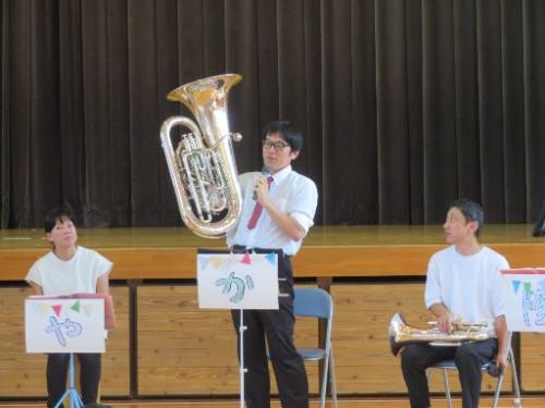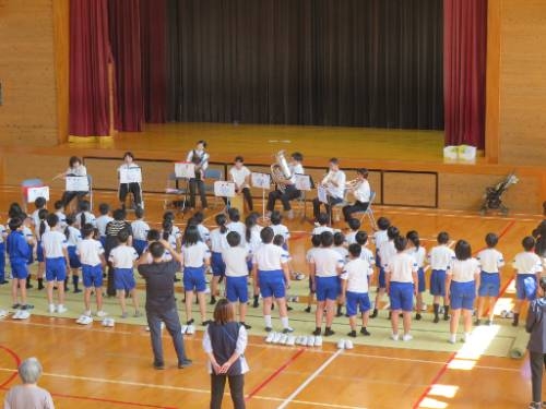子どもたちに人気の鬼滅の刃やダンスホールなどを演奏していただきました。楽器の紹介もあり、子どもたちは普段見ない楽器に興味を持ちました。