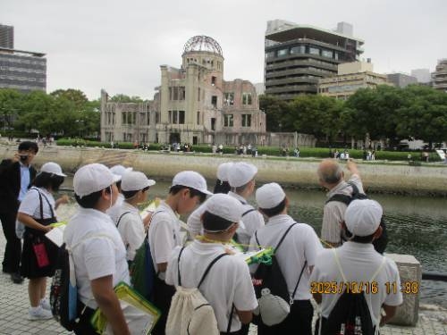 平和学習の様子です。被爆体験のお話を聞いたり、平和公園内の碑を巡りました。平和記念資料館を見学し、原爆について改めて学び、平和の大切さを実感しました。