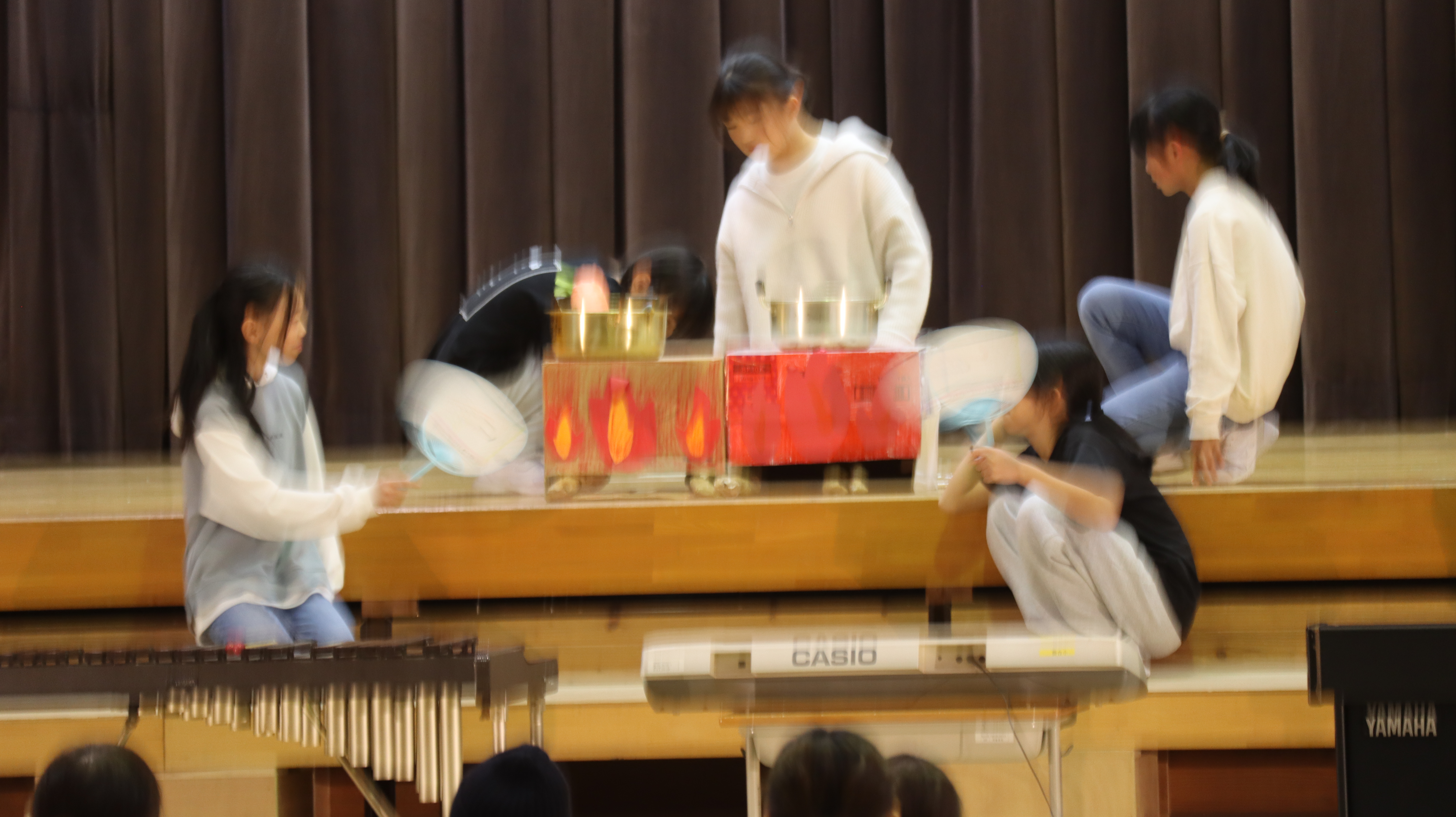6年生はタイムトラベルで歴史で習った平安や戦国、江戸時代の様子を紹介しながら、原爆投下や佐々木偵子さんの折り鶴の話を劇にしました。最後に「世界が一つになるまで」を合唱し、心に染みる発表となりました。