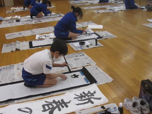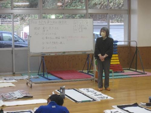 3~6年生が書初め練習をしました。講師として加茂町から濱村愛子先生にお越しいただき、ご指導を受けました。「大きく書くこと」「難しいところはゆっくり書けばよい」「中心線を意識して書くとバランスがよくなる」など、わかりやすく話しながら、お手本を書いてくださいました。