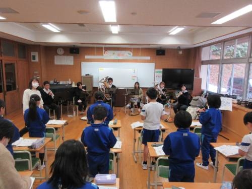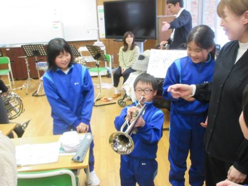 3年生が金管楽器の体験授業をしました。地域の方や保護者の方6名に講師として来ていただき、金管楽器の演奏を聞きました。トランペット、ホルン、チューバがあり、さらにユーホニウムやパーカッションもあり、すてきな演奏でした。