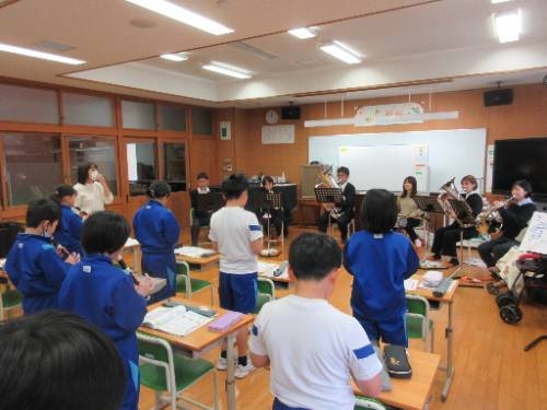 給食も一緒に食べていただき、さらに喜びました。休み時間も早速練習に励んでおり、トランペットの音色が聞こえています。
