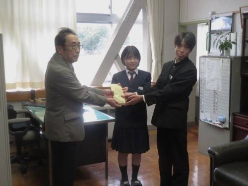 加茂中学校では生徒会活動の一環として、赤い羽根共同募金「学校募金」に取り組んでいます。12/16(火)と12/17(水)の2日間、朝の登校する時間帯に生徒会役員が募金活動を行いました。この2日間で集まった募金を、12/22(月)に雲南市共同募金委員会の方にお渡ししました。この募金は雲南市内の子どもから高齢者までの幅広い福祉活動の支援のために使われます。