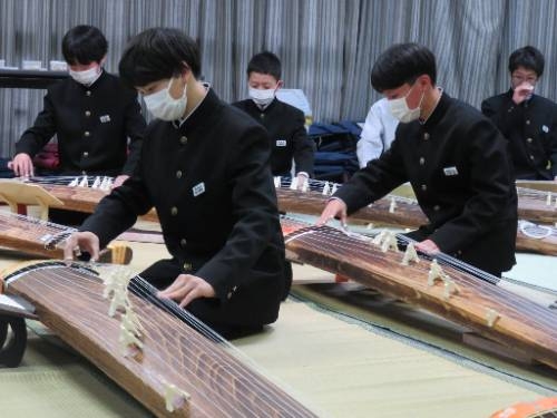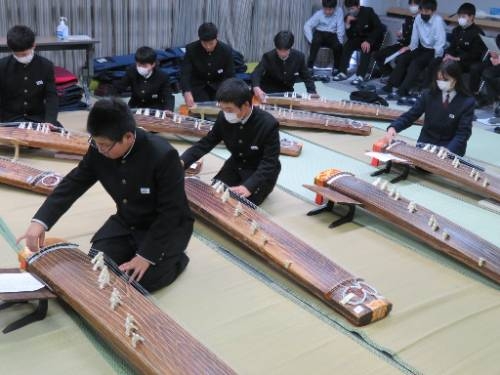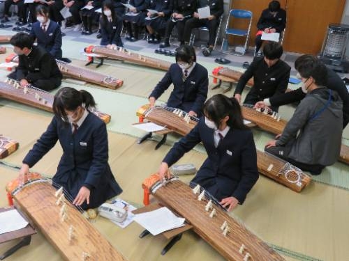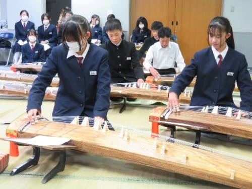 1/21と1/22の2日間、1年音楽の授業で「箏教室」を行いました。この授業では、外部講師として加茂町在住の勝部さん(島根県三曲連盟理事)をお招きし、日本の伝統的な和楽器である「箏(こと)」の奏法を学びました。生徒は楽曲「さくらさくら」を練習し、授業の最後にはグループ全員で演奏しました。授業後の振り返りでは、『はじめは音をうまく弾くことができなかったけれど、練習を繰り返すうちにうまく演奏することができて楽しかったです。』などの感想が聞かれました。今回の授業で、生徒は「箏」の音色の美しさに触れながら和楽器の演奏の楽しさを感じることができました。