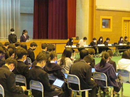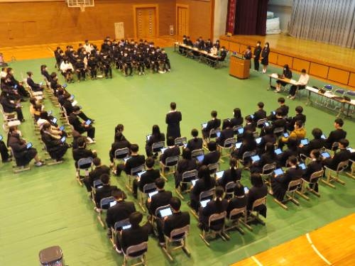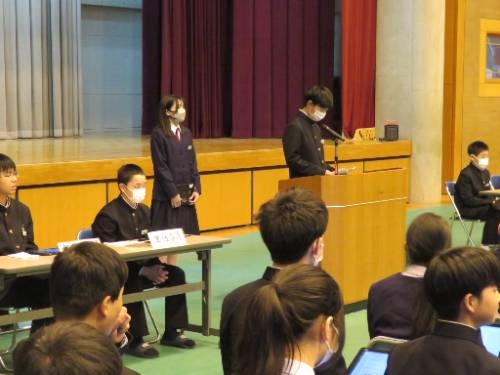 1/27(火)に令和7年度の『生徒総会』を開催しました。今回の生徒総会では、前期生徒会の「振り返り」と後期生徒会の「活動計画」を審議・決定しました。前期生徒会では、これまでの振り返り(反省)と会計の中間決算が報告されました。後期生徒会では、本部と各事業委員会が後期の活動計画について発表しました。発表後は各学級からの質問も出され、各委員長が回答しました。これから後期の生徒会活動が始まりますが、2年生の役員を中心に加茂中学校を盛り上げてほしいと思います。