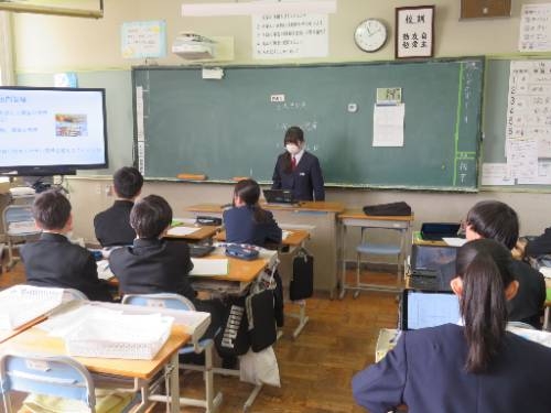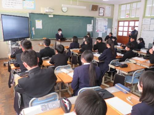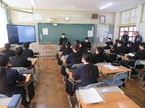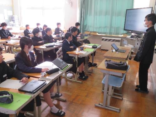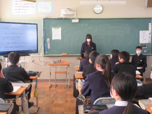 1年生は3学期から総合的な学習の時間に「職業調べ」を行っています。これは、一人一人の生徒が自分の調べたい職業について調べ、プレゼンソフトにまとめる学習内容です。約1か月間かけていろいろな職業について調べましたが、2/12(木)に各学級で「職業調べ発表会」を行いました。一人あたりの発表時間は2分30秒程度に設定され、どの生徒もその時間内で発表できるように準備をして本番を向かえました。発表する生徒は緊張しながらも堂々とした態度で発表し、クラスメートはその発表を真剣な態度で聴くことができました。この学習を通して、自分の調べた職業だけでなく、様々な職業の特徴について知ることができました。