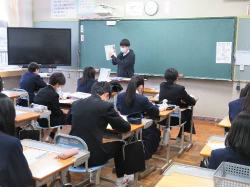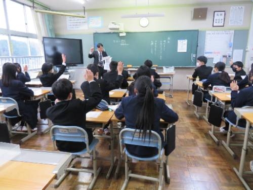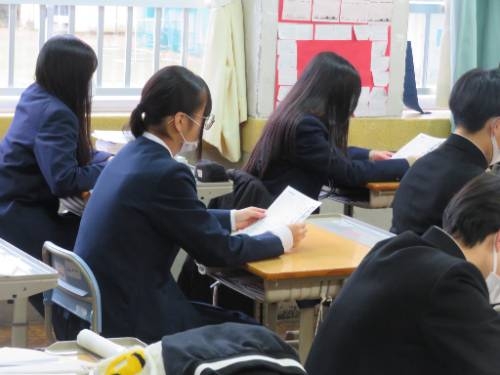本日(1/8)、3学期の始業式を行いましたが、その前に各教室で学級担任が地震発生時の『防災指導』をしました。これは、おととい(1/6)に発生した島根県東部を震源とする地震に伴い、今後1週間程度続くとみられる余震への対応や必要な備えを知っておく必要があることから実施しました。今回は2種類の資料(1/7付けの新聞記事、雲南市防災・減災マニュアル)を使って、地震発生時にすべきことや、揺れが収まったときにすべきことなどについて、重要な震災対策を確認しました。多くの生徒が大規模な地震を初めて経験しましたが、いつでも正しい行動がとれるようになるために、どの生徒も学級担任の話を真剣に聞くことができました。
