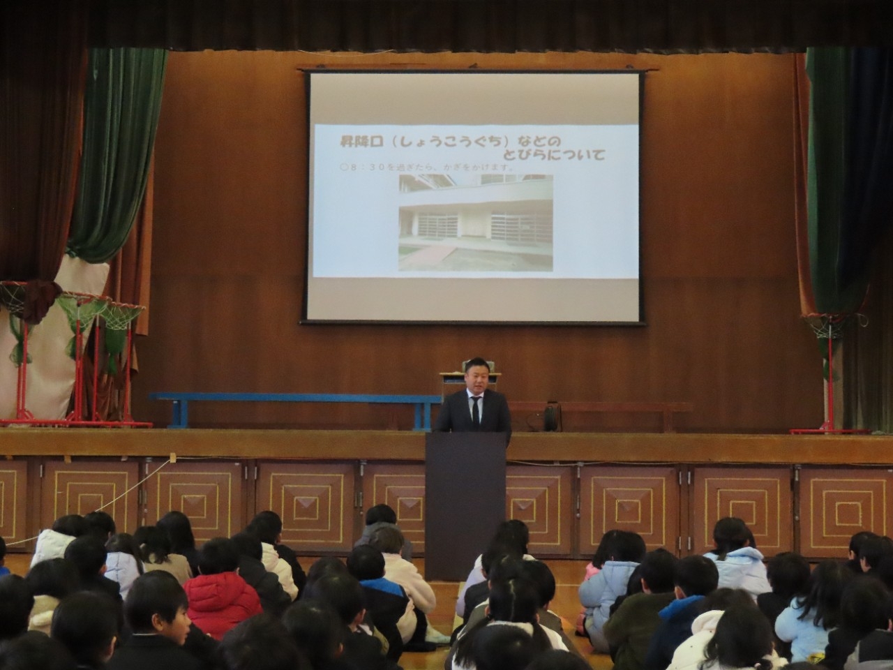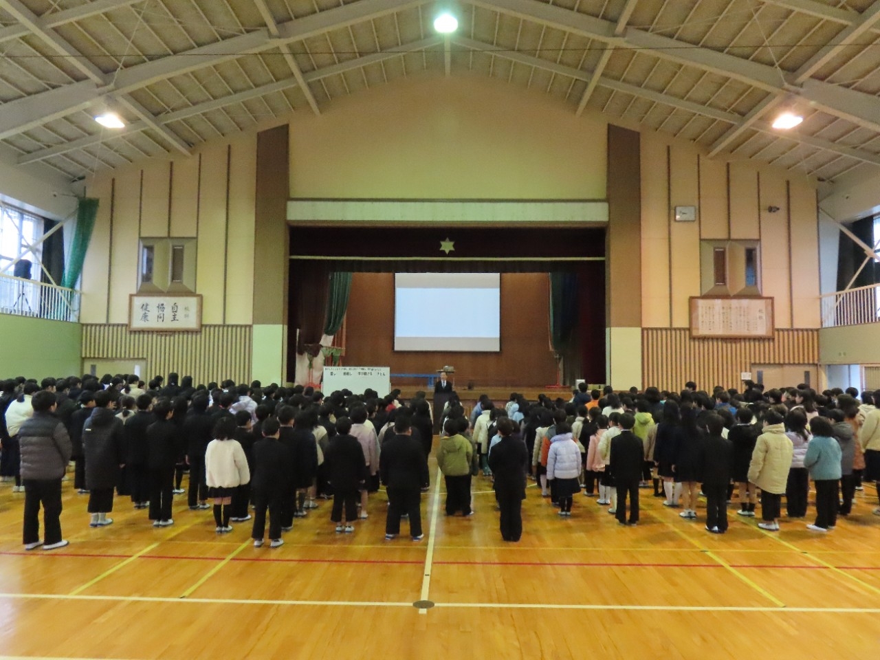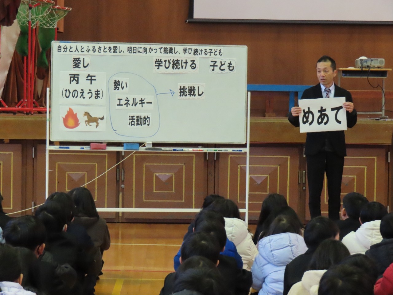 今年は丙午(ひのえうま) エネルギーに満ち溢れる年 何事にも挑戦するために「めあて」を大切にしようと校長からのメッセージがありました。