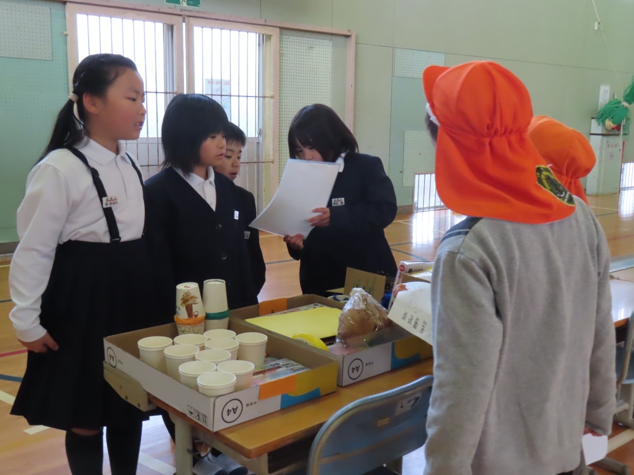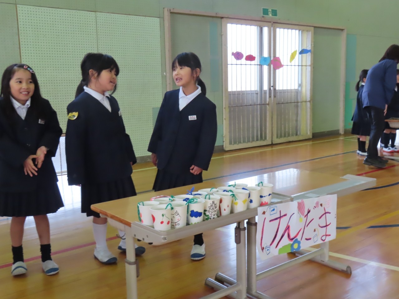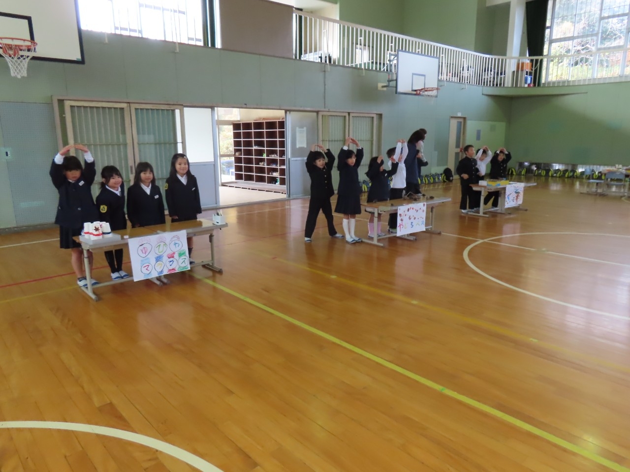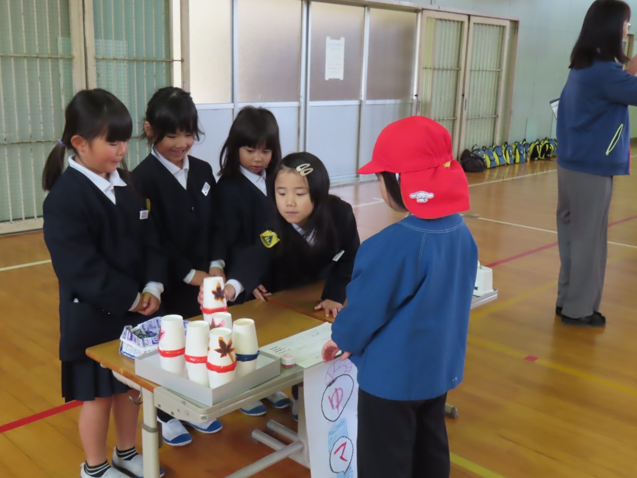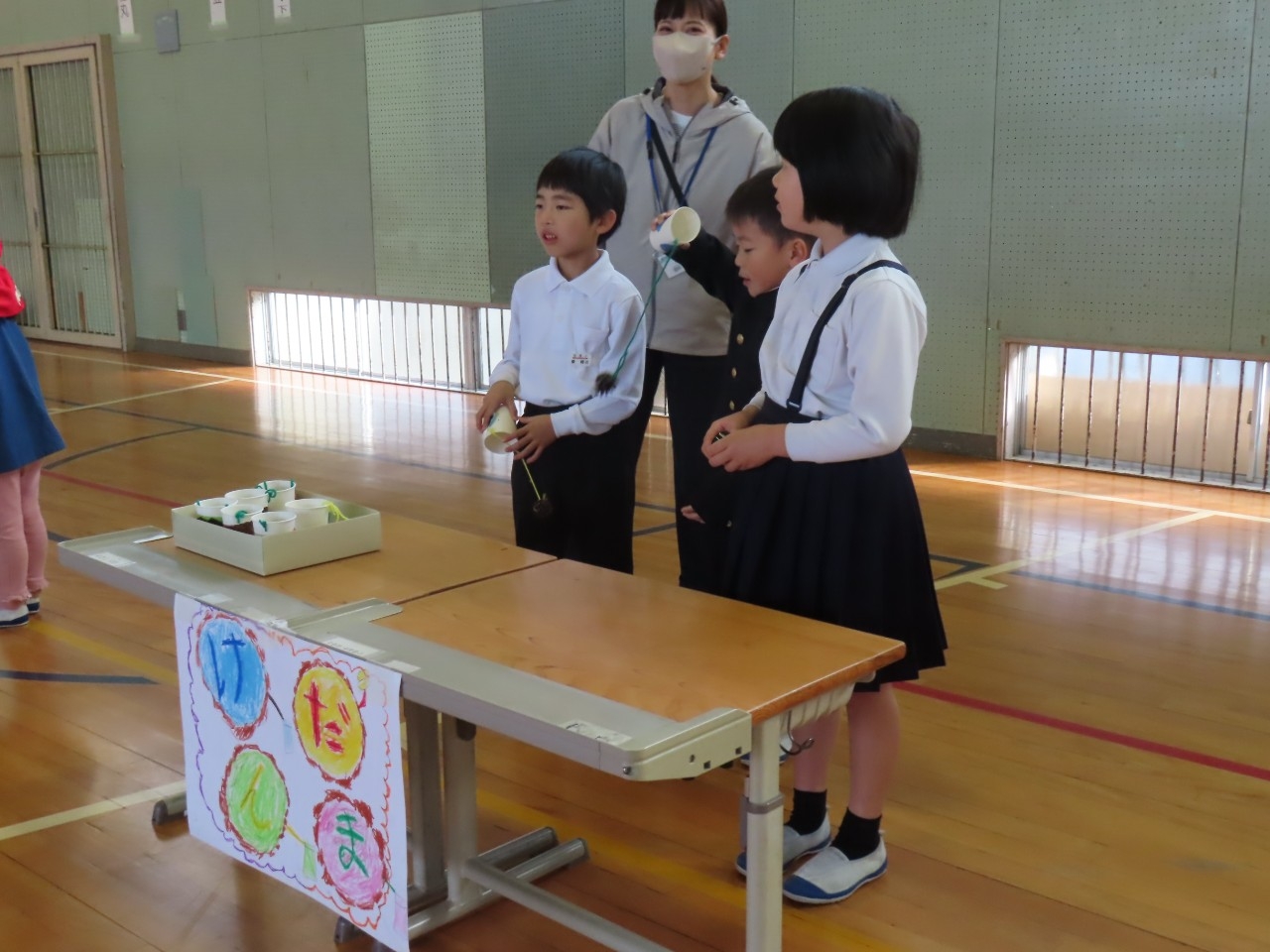 1年生は国語科の時間で学習したことをもとに昔遊び交流会を開催しました。