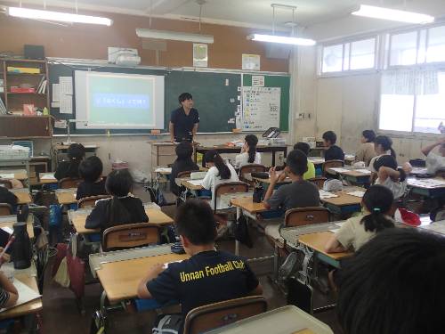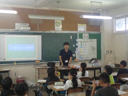 9月8日(月)、4年生は総合的な学習の時間に「福祉」について学習しました。この日は、雲南市社会福祉協議会の職員の方を講師にお招きし、「『福祉』って何だろう?」という問いについて、教えていただきました。講師さんからは、「ふくしは、”ふ”だんの、”く”らしの、”し”あわせ」であり、みんなが住み慣れた地域で自分らしく暮らしていくことであるということを子どもたちに伝えられました。また、日本や雲南市の高齢化の状況をデータをもとにお話しされ、「君たちが気づくこと、感じること、考えること、行動することを大切にしてほしい」と最後に伝えられました。