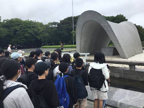 初日は、広島の平和記念公園で被爆体験伝承者の方からお話を聞き、また、原爆の子の像で黙とうなどをしました。班別で原爆資料館を見学し、80年前の広島への原爆投下による惨状やその後の人々の苦しみや、復興について学びました。直接お話を聞いたり、当時の遺品等を直接見たりしたことで、反戦や平和への思いを強くしました。