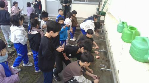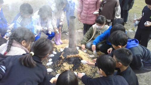 春の苗植えからお世話になった下熊谷交流センターの方々にお世話になって、学校の畑で焼きました。お芋を洗って、新聞とアルミホイルに包み、火起こししてもらったもみ殻の山の中に入れて、待つこと2時間。おいしい焼き芋が完成しました。食べるみんなの顔は、笑顔であふれていました。その後、苗を植えてから水やりや草取りをして育ててきたことを振り返りました。