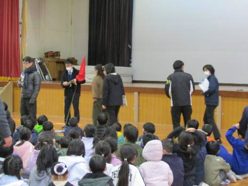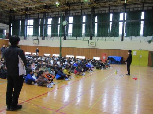 緊急地震速報と、大きな揺れを表す放送があり、それぞれに安全確保をしました。体育館では、ガラスや壁の崩落をさけるため、フロアの中央に固まって安全確保する子どもたちの姿がありました。あいにく雨のため、体育館への避難となりましたが、子どもたちの多くは「お(押さない)・は(走らない)・し(しゃべらない)・も(もどらない)・て(低学年を優先)」の合言葉を守って避難ができました。振り返りでの校長先生のお話も、真剣に聞くことができました。