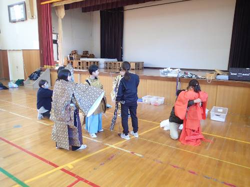クラブ活動は、スポーツ、卓球、日本文化、メディア、神楽、ハンドメイドと6つを開設して活動してきました。日本文化、メディア、神楽、ハンドメイドの4クラブには、地域の講師の方に指導していただきました。最終日のこの日も、講師の方から学び、お茶をたてて飲んだり、パソコンで作成した成果物を発表したり、神楽の衣装を身に着けたりと、普段できないことを体験する子どもたちでした。