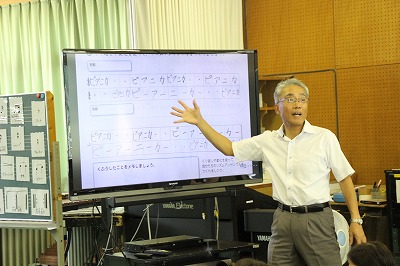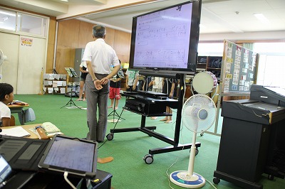 教頭先生の音楽授業 2017-09-08 16:45:27 教頭先生の音楽授業(4年)の様子です。熱心な指導が行われていました。 ipadを大型モニターに映して提示してありました。グループ別の発表で意欲的に意見交換をしていました。