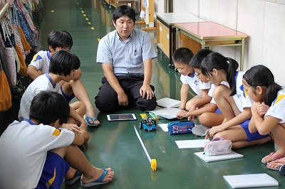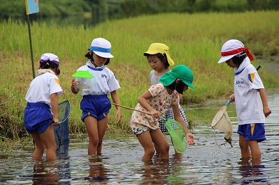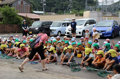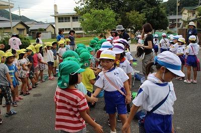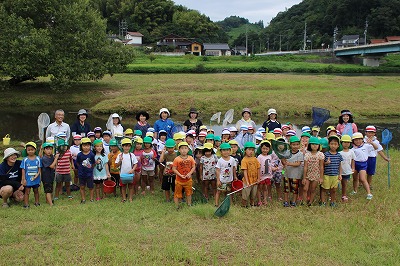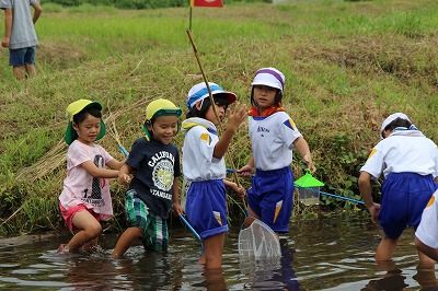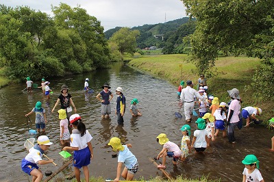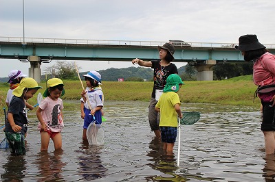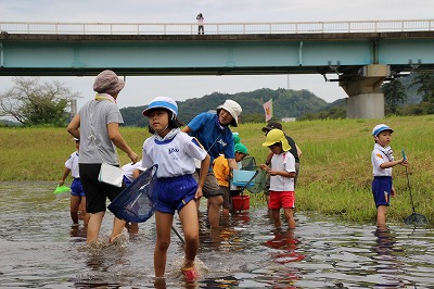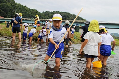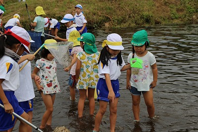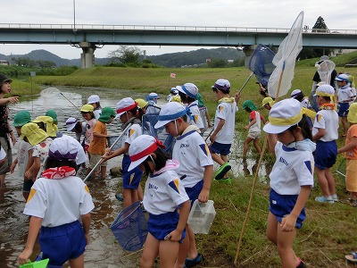子ども園さんとの川遊び(1年) 2017-09-05 13:15:00 1年生が木次こども園の年長さんと一緒に川遊びをして交流をしました。 子ども園の子どもたちに教えてあげたり、一緒に生き物探しをして楽しそうでした。
