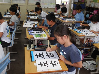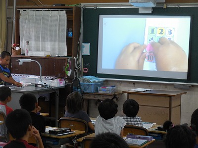 プロジェクターの活用 2017-09-06 12:05:32 2校時に教室を回ってみました。2年生で夏休みの作品紹介で実物投影機とプロジェクターが自然に使われています。 小さい物を大きく映すのに便利です。 実物がよいものは、そのままで使わずに…。 4年生の書写の授業では、筆の運び方の動画を大きく見せていました。 いつでも使える環境が各教室にあると、先生たちは日常的に、必要に応じでうまく使っています!