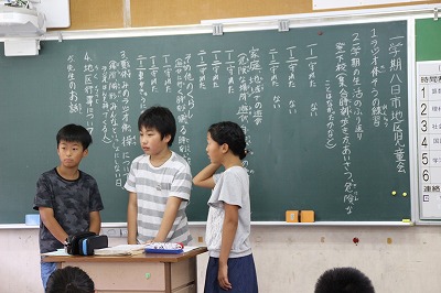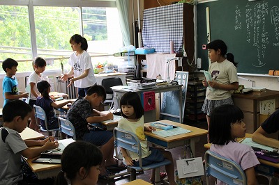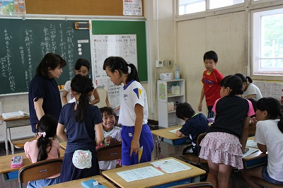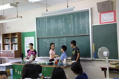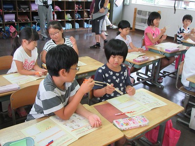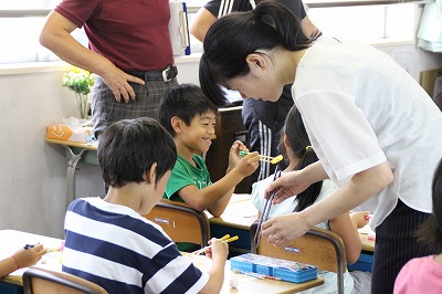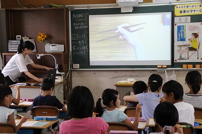 研究授業(3の月食の指導) 2017-07-11 15:17:40 本校では、研究授業を全教員がすることにしていますが、今日は栄養教諭の坂根先生の研究授業がありました。 3の月組で、担任の先生とのTT授業で、食事のマナーやはしの使い方の学習を体験的に学ぶ学習でした。ICT機器も効果的に使われていました。