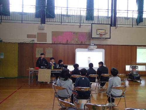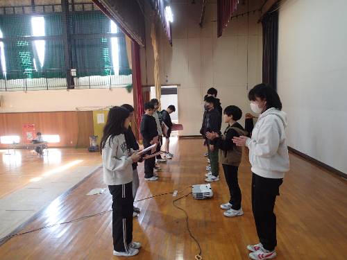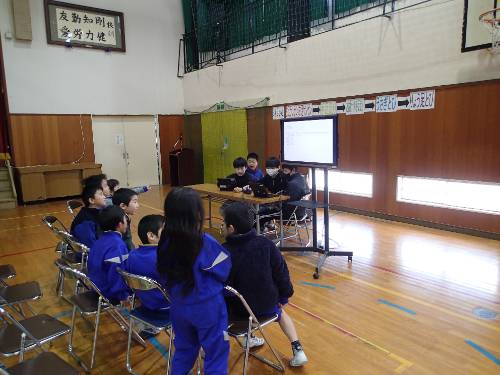 今年度2回目の総会は、各委員会(絆、環境ボランティア、図書、スポーツ、報道、健康の6委員会)から今年度の取組と、来年度に向けてやってほしいことについての発表がありました。5・6年生の各委員会の委員で、スクリーンで示しながら、交代交代に説明をしていきました。今年度一年で、学校を楽しくするために、学校をよりよくするために、たくさんの活動を工夫しながら実行していたのだと改めて思いました。総会の最後には、現在の委員長から5年生代表への引継ぎ式もありました。