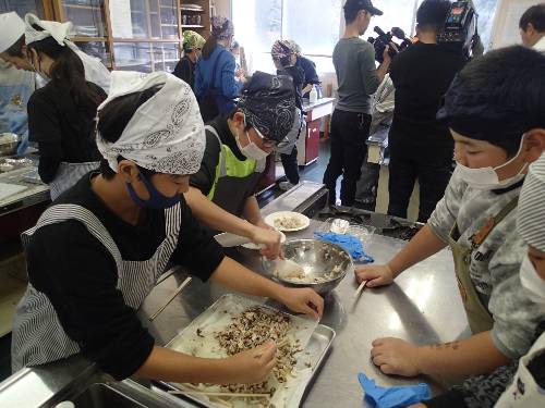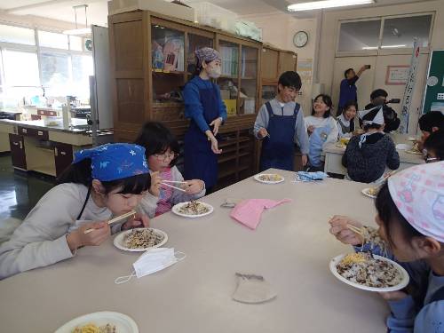 この活動は、日本財団「海と日本プロジェクト」の一環で、木次小学校での活動はさばを題材に、郷土料理の焼きサバずしをつくるというものです。子どもたちは、地域で料理屋を営んでおられる藤原さんを講師としてお招きし、指導を受けました。5年生は春に郷土の「焼きサバ」について学習をしてきたことから、興味をもって取り組みました。普通は串うちをした焼きサバをほぐして作るそうですが、家でも作れるようにフライパンで調理する方法を学びました。
