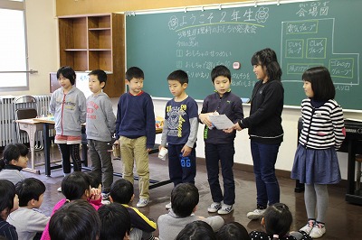 3年生が2年生をお客さんに、理科で学習したおもちゃを紹介する発表会をしました。